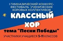 Внмание! Внимание! Внимание! Объявляем о проведении I Гимназического конкурса-фестиваля ученических хоровых коллективов "Классный хор"! Участники конкурса: обучающиеся 5-11 классов. Тема: "Песни Победы". Открытые прослушивания состоятся 25 и 26 апреля. Гала - концерт пройдет 29 апреля. Заявки ждем с 15 по 22 апреля. Более подробную информацию можно получить из положения о конкурсе!