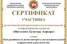В секции для учителей "Как развивать в детях интерес к исследовательской и проектной деятельности" Республиканской проектной и исследовательской конференции школьников "Интеллект. Культура. Карьера", прошедшей на базе МБОУ "Гимназия №90" Советского района г.Казани, приняла участие Хакимова М.С., учитель родного языка и литературы.