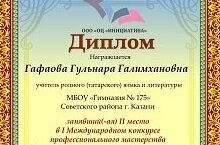 По итогам I Международного конкурса профессионального мастерства "Технологии обучения и педагогические практики" Гафарова Гульнара Галимхановна, учитель родного языка и литературы, заняла 2 место! Поздравляем!