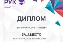 В октябре 2021 года ученика 11б класса Зайнуллина Алия приняла участие в интернет-олимпиаде по русскому языку, организованной Российским университетом кооперации. В ней приняли участие 634 участника из общеобразовательных школ и организаций среднего профессионального обучения РФ. И вот стали известны результаты: Алия заняла 1 место и стала победителем среди обучающихся 11 классов. Поздравляем Алию! Желаем новых побед и достижений!