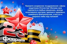 Дорогие мужчины! С Днём защитника Отечества! Желаем вам никогда не падать духом, твердо стоять на ногах, стремиться только к успеху. Пусть смелость и сила оберегают ваши семьи от невзгод. Желаем покорять недостижимые вершины, которые приведут к осуществлению заветных желаний. Упорно иди только вперёд, обходя препятствия. Желаем, чтобы родные вам люди всегда были рядом. Пусть в доме всегда будет слышен детский смех и царит веселье. Здоровья, мира и благополучия всем!
