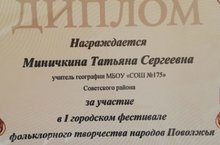 Педагог нашей школы Татьяна Сергеевна Миничкина 20 ноября приняла участие в 1 городском фестивале фольклорного творчества народов Поволжья. Фестиваль проходил в Доме работников образования и был посвящён году народного искусства в России. Татьяна Сергеевна исполнила вокальную композицию "Любо, братцы, любо"