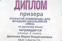 Поздравляем призеров открытой олимпиады для младших школьников "УМКА" по русскому языку Данилову Марию 3 г класс и Михееву Елену 1г класс (учитель Лихачева О.А.). Желаем нашим ученицам новых побед в олимпиадном движении!