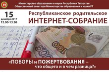 15 декабря в 12:00 состоится Республиканское родительское интернет - собрание "Поборы и пожертвоания - что общего и в чем разница?". Онлайн трансляция на сайте КИУ.РФ. Вопросы принимаются по адресу: roditelirt@mail.ru