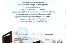 8 октября на базе НОУ ДПО «Центр социально гуманитарного образования» прошла очная олимпиада «Правилограф» в рамках международного проекта «СОМИК». Ученица 3 а класса Ситдикова Самира ( учитель Мусина И.Ф.) стала призером серебряного уровня.