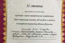 9нчы февральдә Казан шәһәре Яңа Савин районының 103 нче рус-татар гомуми урта белем мәктәбендә Фәнис Яруллин иҗатына багышланган “Мин тормышка гашыйк” исемле шәһәр фәнни-гамәли конференциясе үткәрелде. Бу конференциядә 9 нчы “А” сыйныфы укучысы Гафиятова Зилә “Иҗат бакчасында” секциясендә I урынны (укытучысы Әхтәмова Г.М.), 4 нче “А” сыйныфы укучылары Гыйлманова Әлфинә, Исхакова Зәлия “Юмор һәм сатира” секциясендә II урынны (укытучысы Габделвәлиева Р.Н.), 10 нчы “А” сыйныфы укучысы Гайфуллина Айгөл “Татар әдәбияты үсешендә Ф.Яруллин иҗатының роле” секциясендә II урынны (укытучысы Хәкимова М.С.) яуладылар. 8 нче “А” сыйныфы укучысы Әхтәмова Әдилә һәм 6 нчы “А” сыйныфы укучысы Алеева Азалия (укытучылары Әхтәмова Г.М.,Гафарова Г.Г.) уңышлы чыгыш ясап, сертификат белән бүләкләнделәр. Конференциядә катнашкан укучыларга һәм укытучыларга алга таба да уңышлар телибез!
