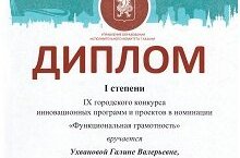 11 декабря на базе Управления образования г.Казани прошел очный этап IX городского конкурса инновационных программ, проектов и методической продукции. В конкурсе приняло участие 86 образовательных организаций города Казани, 188 педагогов. Экспертами выступили преподаватели ИРО РТ, КФУ, руководители образовательных организаций, тьюторы по инновационной деятельности. Победителем в номинации «Функциональная грамотность» стала заместитель директора по учебной работе, учитель русского языка и литературы Ухванова Г.В. Поздравляем! Желаем вам новых творческих идей и открытий, реализации всех планов и проектов.