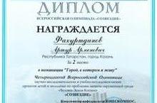 Фахуртдинов Артур, ученик 10а класса, стал призером Четырнадцатой Всероссийской олимпиады научно-исследовательских и учебно-исследовательских проектов детей и молодежи по проблемам защиты окружающей среды «Человек-Земля-Космос» «СОЗВЕЗДИЕ», проходившей с 23 по 26 апреля в г. Королев.