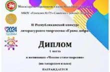 С 5 по 22 марта 2024 года прошел II Республиканский конкурс литературного творчества "Грани добра", в котрой приняли участие 287 обучающихся из общеобразовательных организаций Республики Татарстан. Школьники имели возможность показать свой талант, мастерство, гениальность в трех номинациях: "Чтение стихотворения", "Чтение прозы", "Проба пера" по тематическим направлениям: «Сила добра», «За природу в ответе и взрослые, и дети», «Тепло сердец для милых мам», «О папе расскажем стихами и прозой», «Славен человек делами», «Широка страна моя родная», «Поэзию, как трепет сердца, никто не властен отменить». Выражаем благодарность всем участников конкурса, ярким, одаренным, творческим личностям, выражаем искреннюю благодарность также педагогам, подготовившим воспитанников к конкурсу. Виват, таланты!