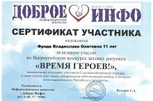 В преддверии дня Героев Отечества ученики 5б класса Гагарова Александра, Капустенко Павел, Толокнова Полина, Фриде Владислава под руководством учителя истории Корниловой Екатерины Дмитриевны приняли участие во Всероссийский конкурсе детских рисунков «ВРЕМЯ ГЕРОЕВ», в рамках которого предлагалось творчески поддержать участников Специальной военной операции, а также вспомнить и почтить память героев, которые когда-либо защищали свободу и интересы многонационального Российского государства. Желаем ученикам дальнейших творческих успехов!