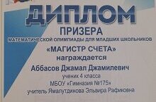 Поздравляем Аббасова Джамала, ученика 4г класса, с призовым местом в городской олимпиаде "Магистр счета" (учитель Ямалутдинова Эльвира Рафиковна). Желаем Джамалу дальнейших побед!