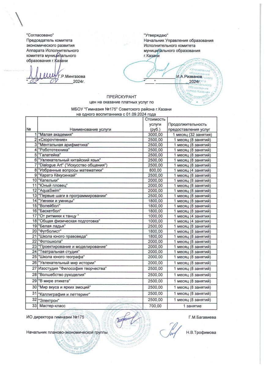 Прейскурант цен на оказание платных услуг по МБОУ "Гимназия №175"