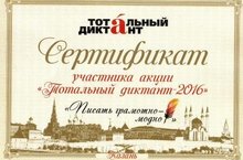 «Писать грамотно - модно» – таков девиз ежегодной международной акции по проверке грамотности «Тотальный диктант», в которой ежегодно принимают участие несколько сот человек со всего мира. Наш сотрудник Гринкевич Н.А. уже в третий раз приняла участие в этой грандиозной акции. В этом году она написала диктант на оценку «четыре». Искренне поздравляем методиста с хорошими результатами, разделяем с ней её радость и обещаем, что в следующий раз мы пойдем писать диктант дружным коллективом и, быть может, улучшим статистику по отличникам. А в этом году, к сожалению, Казань по массовости оказалась в хвосте.