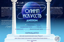 Старшая сборная экологического театра «Радуга» со спектаклем «Братья по разуму» завоевала диплом лауреата I степени международного конкурса театрального творчества «Олимп искусств», прошедшего в июле на базе инновационной образовательной платформы «ARTCOMPASS». Высокую оценку нашей работе поставили члены жюри из Москвы, Питера и даже… Нью-Йорка! Благодарственные письма получили руководители А.А.Шкуро и И.В.Гордеева, похвалы удостоены все артисты-участники и, в первую очередь, Таисия Мауль. За шесть лет занятий в театре она заслужила право сама выбирать себе роль и снова стала Зайкой: характер у него многоплановый и в каждом сценарии разный. Из отзыва члена жюри С.Л.Стуликовой, актрисы театра и кино, сценариста, композитора и режиссёра детских спектаклей в молодёжном театре на Фонтанке: «…Зайцу – сразу 10 баллов за образ, характер и яркое существование... У ребят большой потенциал, и они чувствуют себя комфортно и получают удовольствие! Молодцы! Продолжайте творить!»