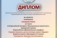Ученица 5 А Гумирова Раяна приняла участие и заняла призовое II место во Всероссийской викторине «Функциональная грамотность», проводимой в рамках Всероссийского образовательного марафона «Гордимся прошлым, ценим настоящее, верим в будущее» Возрастная группа: обучающиеся 5-9 классов. Руководитель: Вавилова Елена Викторовна