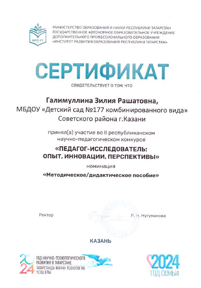 Воспитатель по обучению детей татарскому языку приняла участие во втором республиканском научно- педагогическом конкурсе. Представила методическое пособие "Увлекательный ковёр" для закрепления лексических тем татарского языка. -