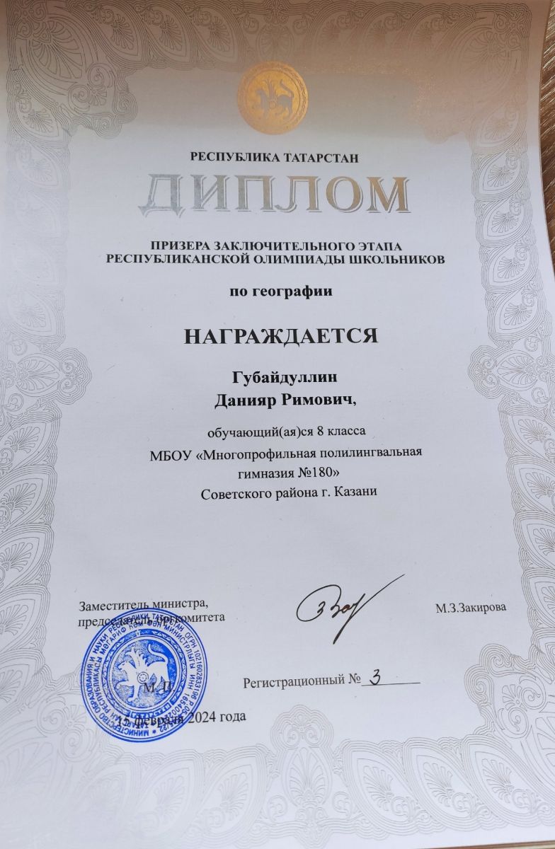 - Губайдуллин Данияр - ПРИЗЁР заключительного этапа Республиканской олимпиады школьников по географии (учитель - Шахов С.Е.);