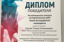 Поздравляем ученика 9г класса Гурьева Тимура и учителя технологии Юнусова Ильсура Шайхулловича с ПОБЕДОЙ в Республиканском конкурсе проектных и исследовательских работ "Юный исследователь"! Молодцы!