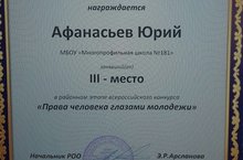 Наш ученик Афанасьев Юрий занял 3 место в районном этапе всероссийского конкурса " Права человека глазами молодежи". Молодец! Так держать!