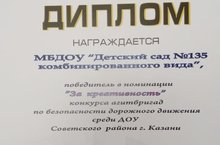 Коллектив нашего детского сада стал победителем в номинации "За креативность" конкурса агитбригад по безопасности дорожного движения среди дошкольных учреждений Советского района г.Казани и награжден дипломом. УРА! Поздравляем!
