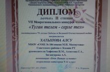 Ученица 9а класса Хатыпова Алсу участвовала в VII Межрегиональном конкурсе чтецов "Туган телем - серле тел", посвященного 75-летию Победы в Великой Отечественной войне и стала лауреатом II степени. Выражаем благодарность учителям родного языка. Поздравляем!