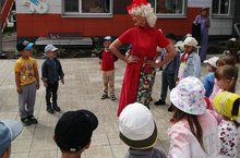 Вместе с Чебурашкой дети танцевали, играли в подвижную игру «Водяной», показали свою ловкость в эстафетах «Курица с яйцом», «Переправа», «Через реку», «Бег по лужам». Проведя с ребятами Викторину «Загадки от Чебурашки», узнала какие наши почемучки умные и смышлёные. С такой озорной детворой не хотелось конечно прощаться, поэтому Чебурашка поиграла с детьми в хороводную игру «Ходит Лето» и устроила весёлую дискотеку с воздушными шарами!