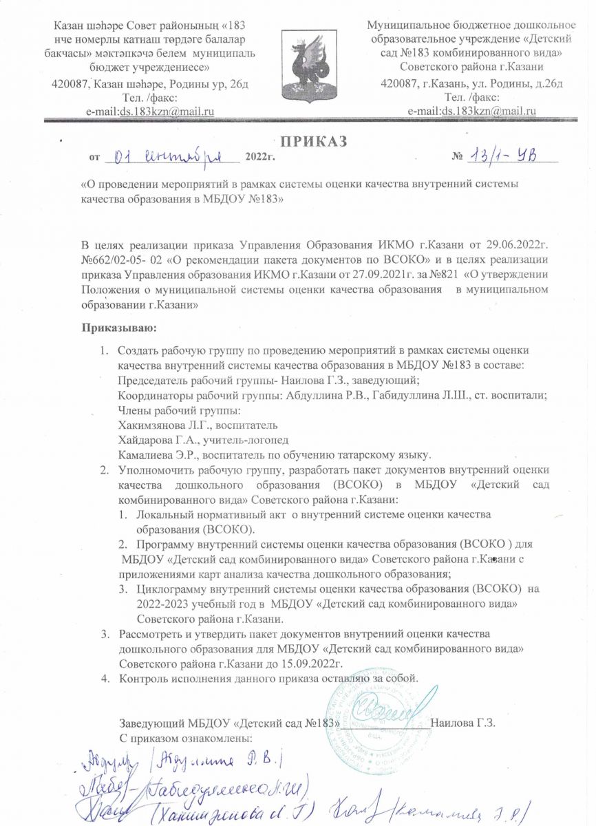 Приказ о проведении мероприятий в рамках ВСОКО в МБДОУ "Детский сад № 183"