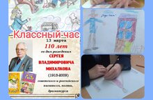 13 марта 2023года классные руководители школы- интерната 11 провели классный час на тему: 110 лет со дня рождения советского писателя и поэта, слов гимна СССР и гимна России С В. Михалкова. Цель занятия: расширять представления обучающихся о творчестве С. В. Михалкова, воспитывать нравственно - ценностей взаимоотношения со сверстниками на примерах героев произведений С. В. Михалкова, развивать познавательную активность и интерес к творчеству писателя.