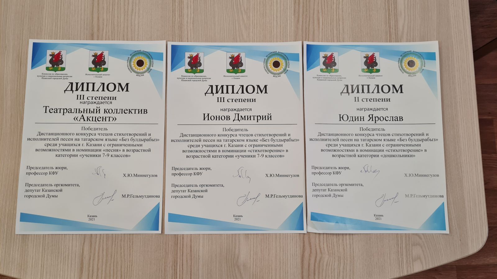 Опубликовано: 18.02.2021Состоялось награждение на Серова 4А в "Шатре" победителей Дистанционного конкурса чтецов стихотворений и исполнителей песен на татарском языке "Без булдырабыз" среди учащихся г. Казани с ограниченными возможностями в номинации "песня", "стихотворение", где дети "Казанской школы-интерната №11" заняли призовые места.
