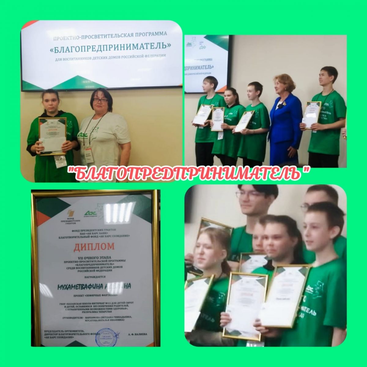 Опубликовано: 24.04.2024С 17.04 - 24.04.24 г. в лагере " Волга" проходил VII очный этап проектно-просветительской программы "Благопредприниматель" среди воспитанников детских домов Российской Федерации,организованный БФ "АК БАРС СОЗИДАНИЕ". Наши дети приняли участие и в финал вышла Аделина М., ученица 8 класса с проектом "Зехфирные фантазии" (грант на 50000 руб.), педагоги Варламова С.Г. и Мусатова Н.И. Поздравляем победителей!!!