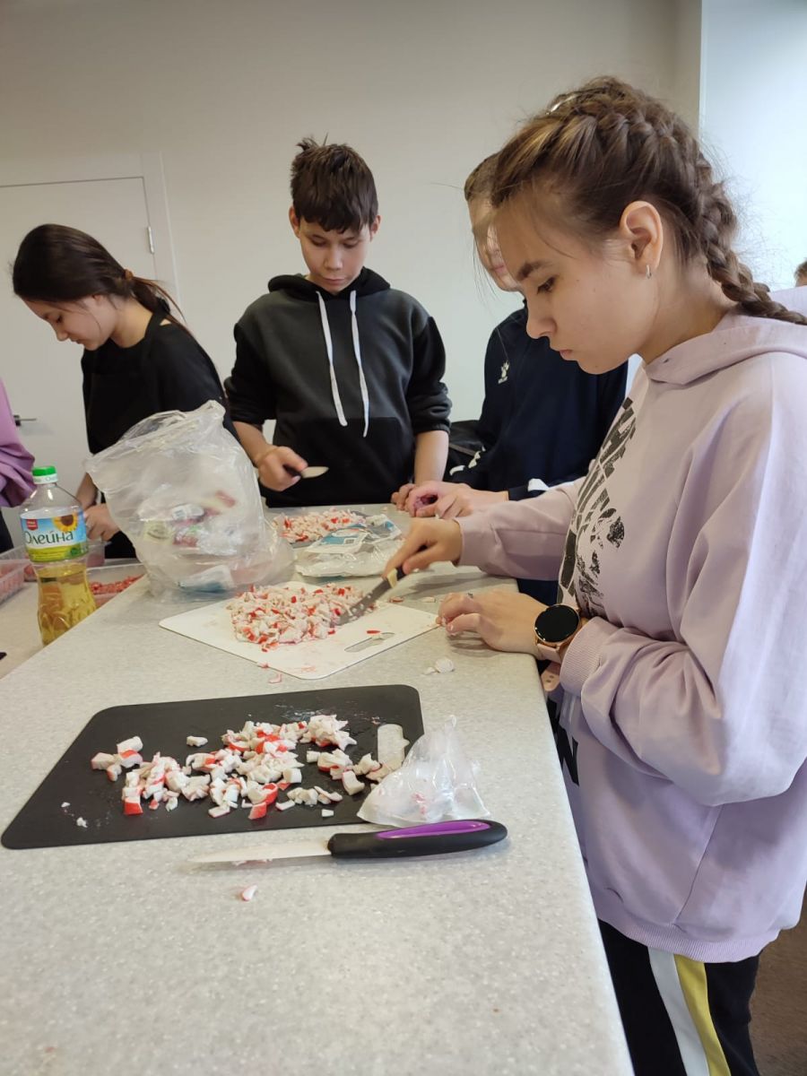 Опубликовано: 01.05.20251.05.2025 г. на базе школы-интерната совместно с волонтёрским клубом "Терра" и детьми нашего интерната, был проведён мастер-класс по приготовлению блюда "мясо по-французски" и овощного салата ( крабовый). Ребята также познакомились с технологией приготовления этих блюд. Перед началом работы с детьми провели инструктаж по технике безопасности при приготовлении пищи и закрепили правила гигиены. Дети подговили все ингредиенты, необходимые для приготовления. Воспитанники помыли картошку, очистили картофель, репчатый лук и нарезали лук полукольцами, картофель тонкими пластинами. Для приготовления "мяса по-французски" взяли фарш. Все ингридиенты выложили в форму для выпечки: первым слоем картофель, фарш, лук, каждый слой смазывался майонезом. Затем отправили в духовку. Через час посыпали сыром и оставили в духовке до готовности. Следующим этапом работы стало приготовление салата из крабовых палочек: дети очистили лук, морковь (отварная), яйца и нарезали кубиками, перемешали всё с отварным рисом и заправили майонезом. Блюда получились вкусные, ребята остались довольны.