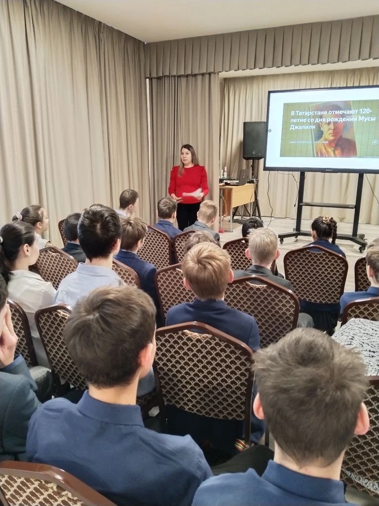Опубликовано: 16.02.202616 февраля в рамках проекта «Разговоры о важном» для учащихся школы – интерната №11 прошёл час мужества «В отважном сердце вечность есть», посвященный 120-летию татарского поэта-героя Мусы Джалиля. На его стихах, проникнутых мужеством, было воспитано ни одно поколение. Хотя его жизнь закончилась трагедией в руках фашистов, но поэтическая судьба была счастливой. Учащиеся узнали о суровых фронтовых буднях поэта, о страшном времени, проведенном в фашистских застенках концлагерей, в которых единственным оружием Мусы Джалиля были его стихи. Познакомились с его стихами из «Моабитской тетради», написанными в застенках военной тюрьмы в Берлине. Ни жестокие пытки, ни камера смертников не сломали волю поэта. Он был казнён, не предав Родины, как герой. Имя Мусы Джалиля стало олицетворением гуманизма, символом мужества. Он прожил короткую, но яркую жизнь, наполненную кипучей деятельностью. Память о Мусе Джалиле навсегда останется в сердцах всех тех, кому дорога история и культура многонациональной России. Каждый раз, перечитывая его стихи, мы вновь чувствуем силу человеческого духа, стойкость характера и глубокую любовь к Родине.