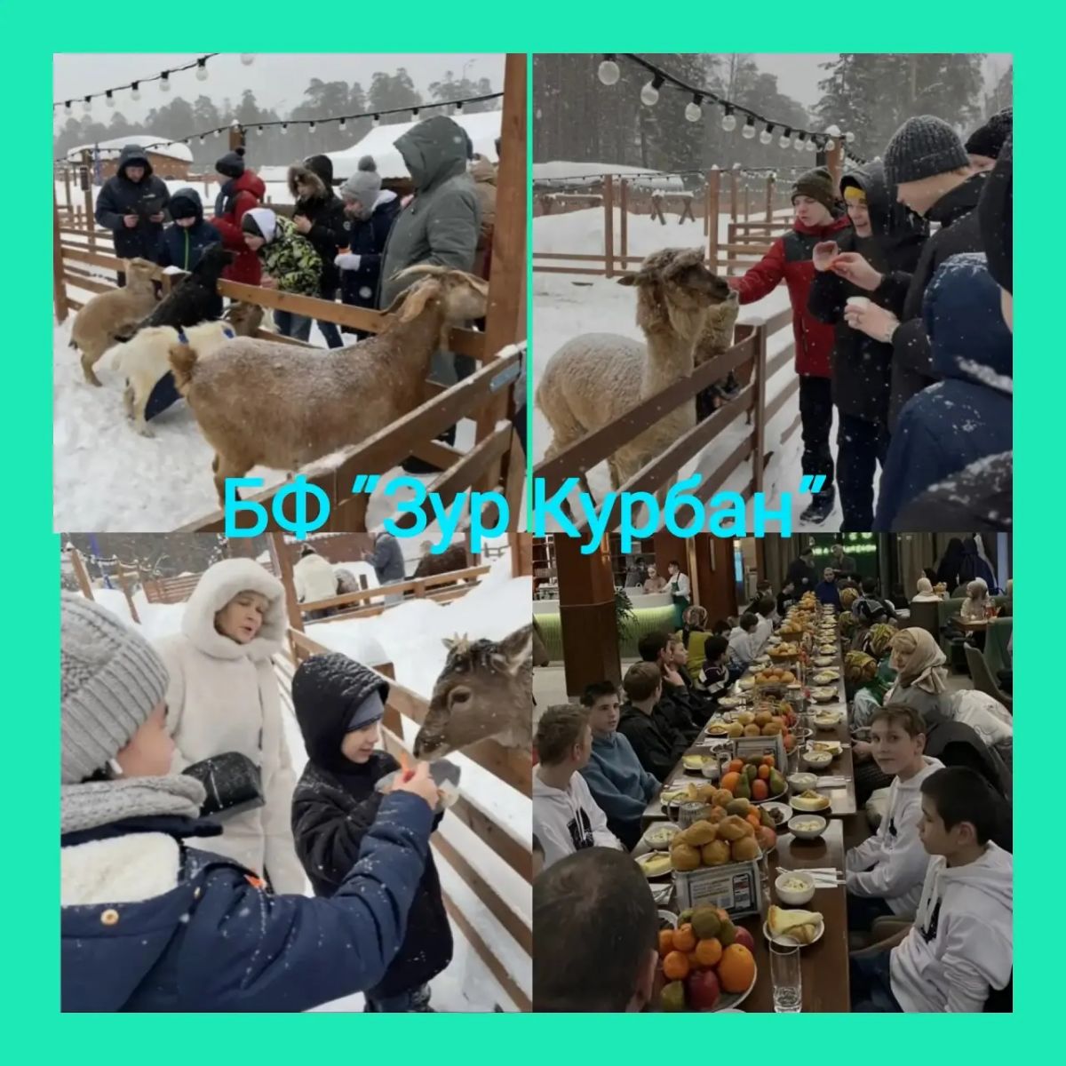 Опубликовано: 20.02.202620.02.2026 года Благотворительный Фонд Зур Курбан организовал экскурсию для воспитанников школы-интерната 11 в парк Альпак Симба, который находится в живописном месте озера Лебяжье.Это место, где стираются границы между человеком и природой полностью. Пушистые аборигены из Перу: альпаки, козочки и кролики приняли детей на уютной ферме как давних знакомых. Дети покормили и погладили животных, которых они увидели в жизни так близко в первые.Сочетание увлекательной экскурсии и чаепития на природе около костра очень понравилось детям. Вечером по сложившейся традиции воспитанников ждал вкусный ужин в кафе «Азу».