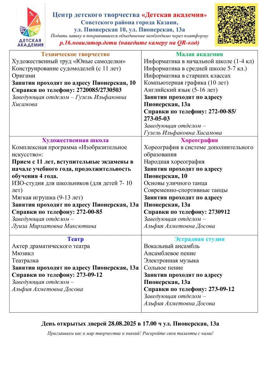 Запись в объединения осуществляется через систему «Навигатор». День открытых дверей запланирован на 3 сентября в 17:00.