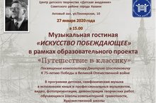 27 января 2020 года в 15.00 в Центре детского творчетсва "Детская акаедмия" состоится Музыкальная гостиная "Искусство побеждающее" в рамках образовательного проекта "Путешествие в классику" , посвященное композитроу Д.Шостаковичу. Мероприятие приурочено к годовщине освобождения Ленинграда от фашистской блокады.