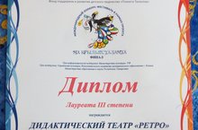 Обучающиеся дидактического театра "Ретро" (педагог Шарипова Д.Р.) приняли результативное учаестие в финале Международного конкурса-фестиваля в рамках проекта "На крыльях таланта" пи поддержке Министерства культуры РФ, Управления культуры г. Казани, Министерства образования и науки РТ и стали обладателями диплома лауреата 3 степени в номинации "Театральный жанр- Драматический спектакль".