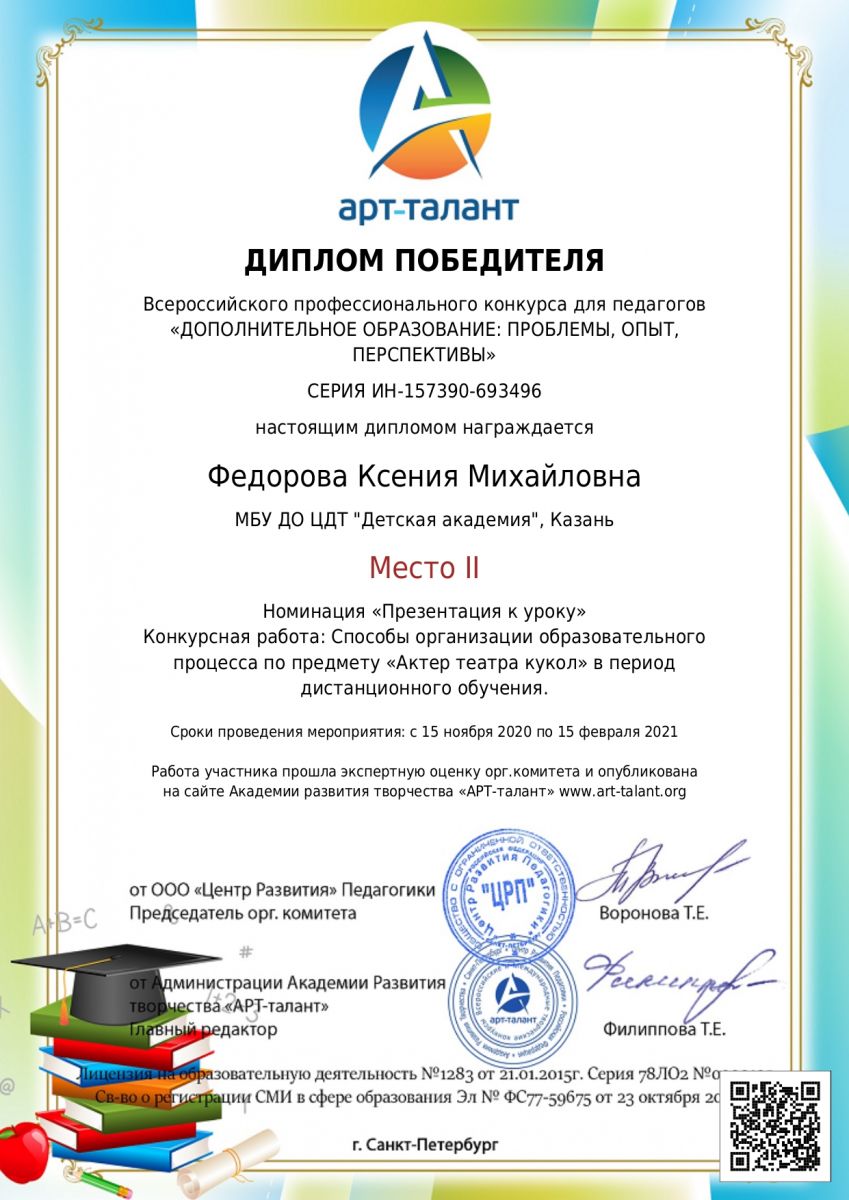 Опубликовано: 17.02.2021Дипломом победителя за II место Всероссийского профессионального конкурса для педагогов «ДОПОЛНИТЕЛЬНОЕ ОБРАЗОВАНИЕ: ПРОБЛЕМЫ, ОПЫТ, ПЕРСПЕКТИВЫ», награждается Федорова Ксения Михайловна МБУ ДО ЦДТ "Детская академия", Казань Номинация «Презентация к уроку» Конкурсная работа: Способы организации образовательного процесса по предмету «Актер театра кукол» в период дистанционного обучения.
