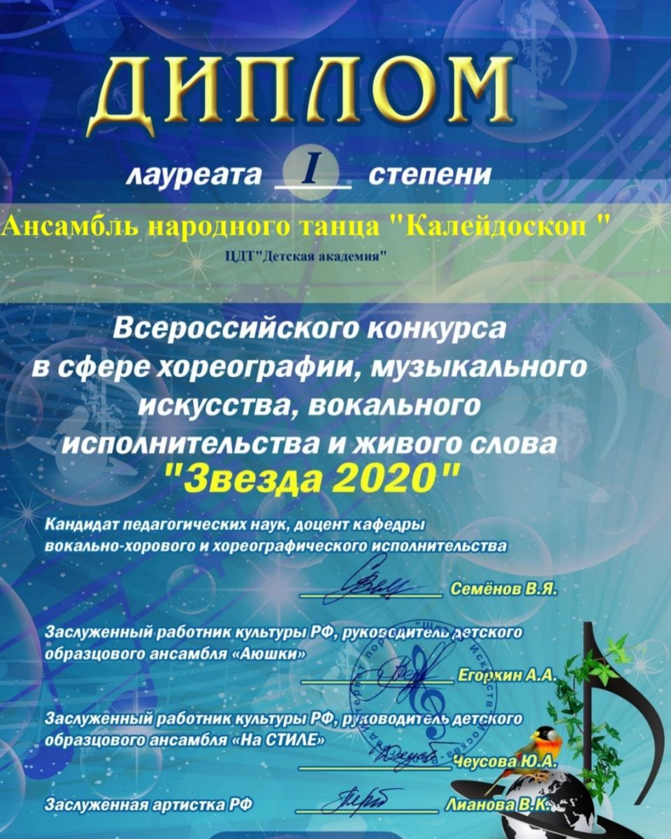 Опубликовано: 18.02.2021Хореографический ансамбль «Калейдоскоп» принял участие во Всероссийском конкурсе в сфере хореографии, музыкального искусства, вокального исполнительства и живого слова «Звезда 2020». И стали Лауреатами I степени. Поздравляем ребят и педагога Савенкову Венеру Расимовну. Желаем дальнейших побед!