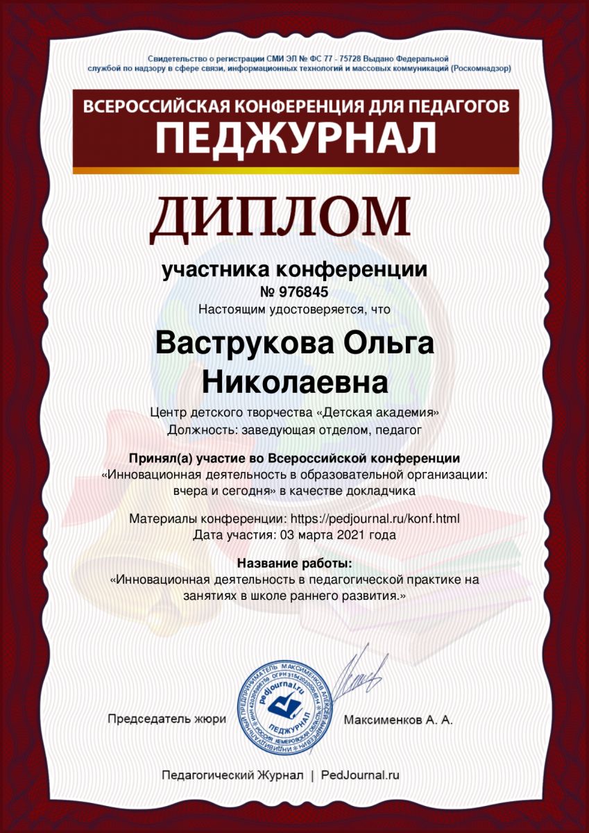 Опубликовано: 03.03.2021Ваструкова Ольга Николаева заведующая отделом и педагог приняла участие во Всероссийской конференции «Инновационная деятельность в образовательной организации: вчера и сегодня» в качестве докладчика. С работой «Инновационная деятельность в педагогической практике на занятиях в школе раннего развития»