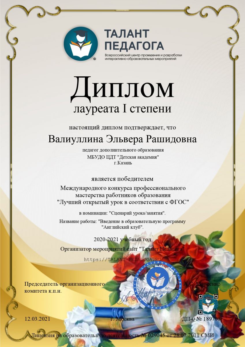 И так же Валиуллина Эльвера Рашидовна педагог дополнительного образования МБУДО ЦДТ "Детская академия" г.Казань является победителем Международного конкурса профессионального мастерства работников образования "Лучший открытый урок в соответствии с ФГОС" в номинации: "Сценарий урока/занятия". Название работы: "Введение в образовательную программу "Английский клуб".