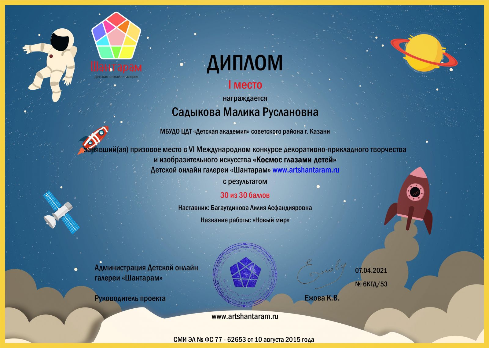 Опубликовано: 28.04.2021Обучающиеся изо студии приняли участие шестом Международном конкурсе декоративно – прикладного творчества и изобразительного искусства «Космос глазами детей» и были награждены Дипломами первой степени! Поздравляем педагогов и ребят с победами!