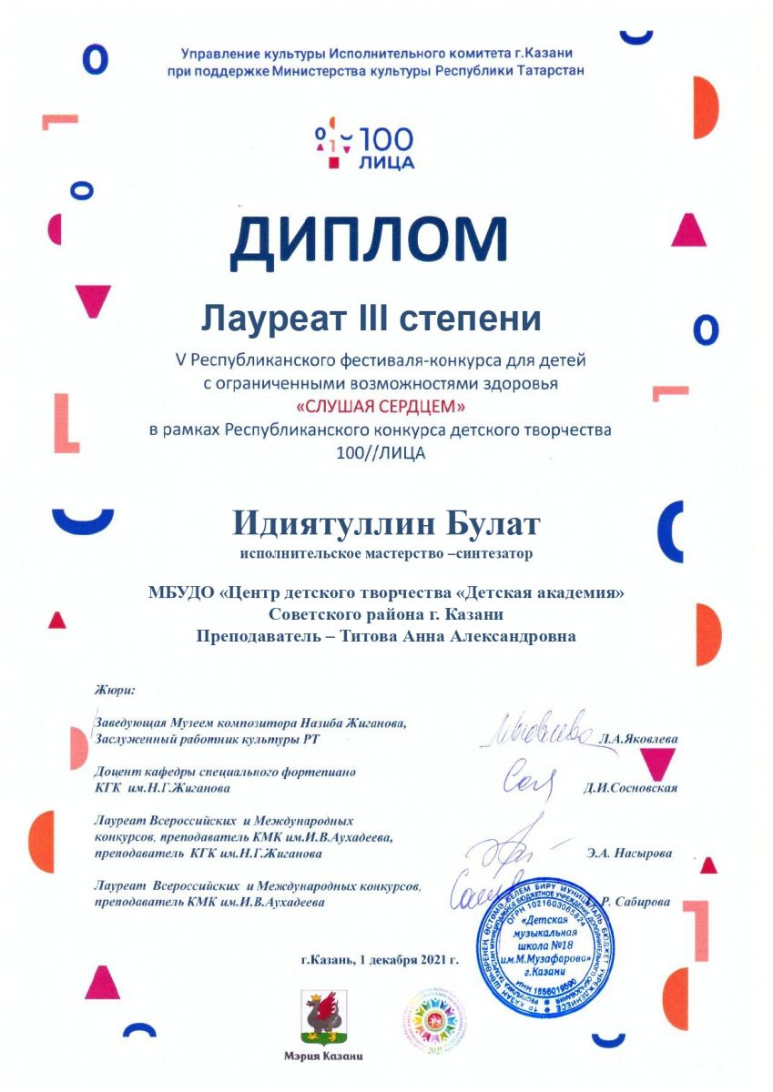 Опубликовано: 13.12.2021Обучающийся эстрадной студии класса электронной музыки Идиятуллин Булат принял участие в V Республиканском фестивале – конкурсе для детей с ограниченными возможностями здоровья «Слушая сердцем» в рамках Республиканского конкурса детского творчества 100//лица и стал Лауреатам III степени. Поздравляем педагога Титову А.А. и Булата с победой!