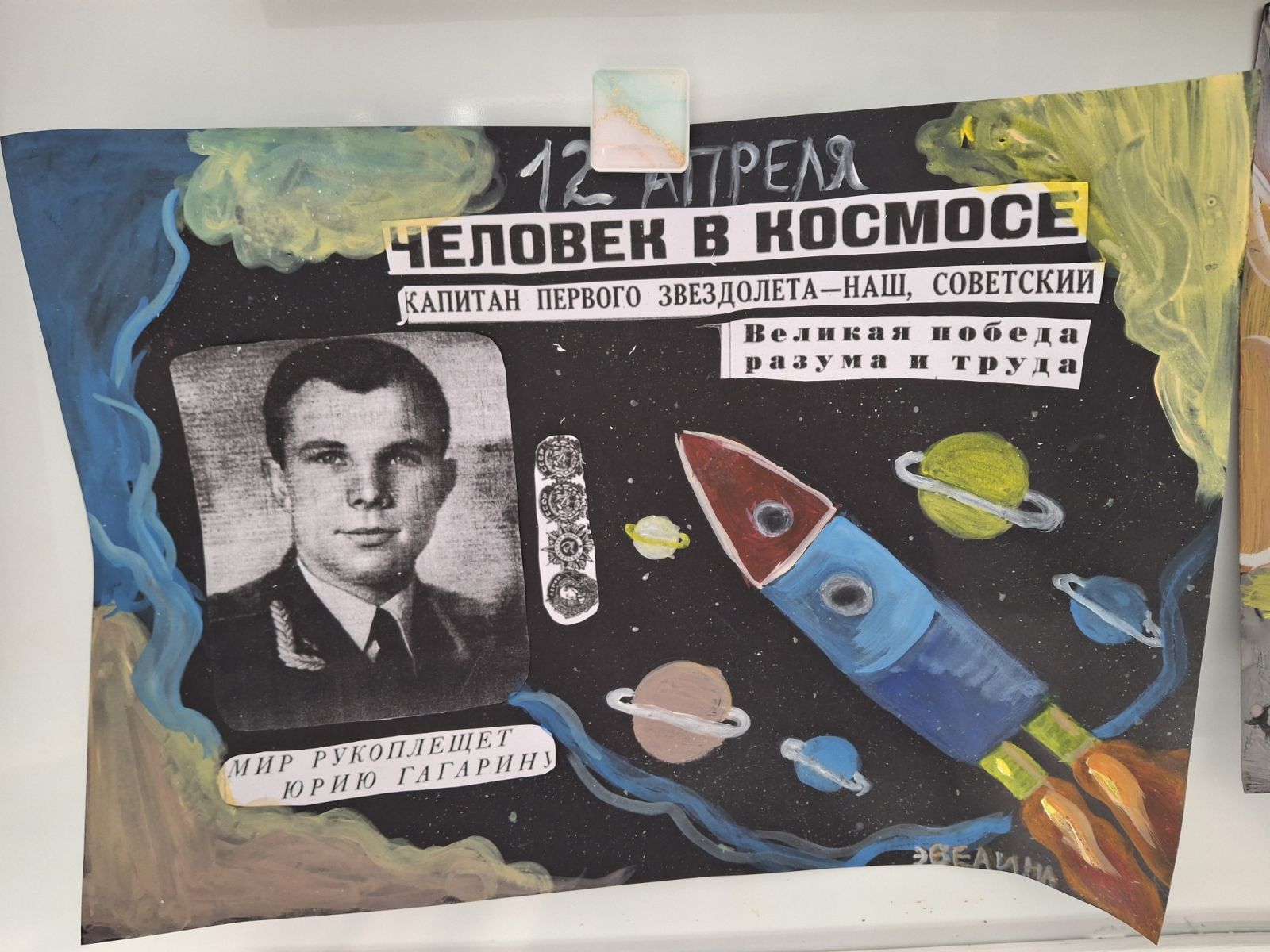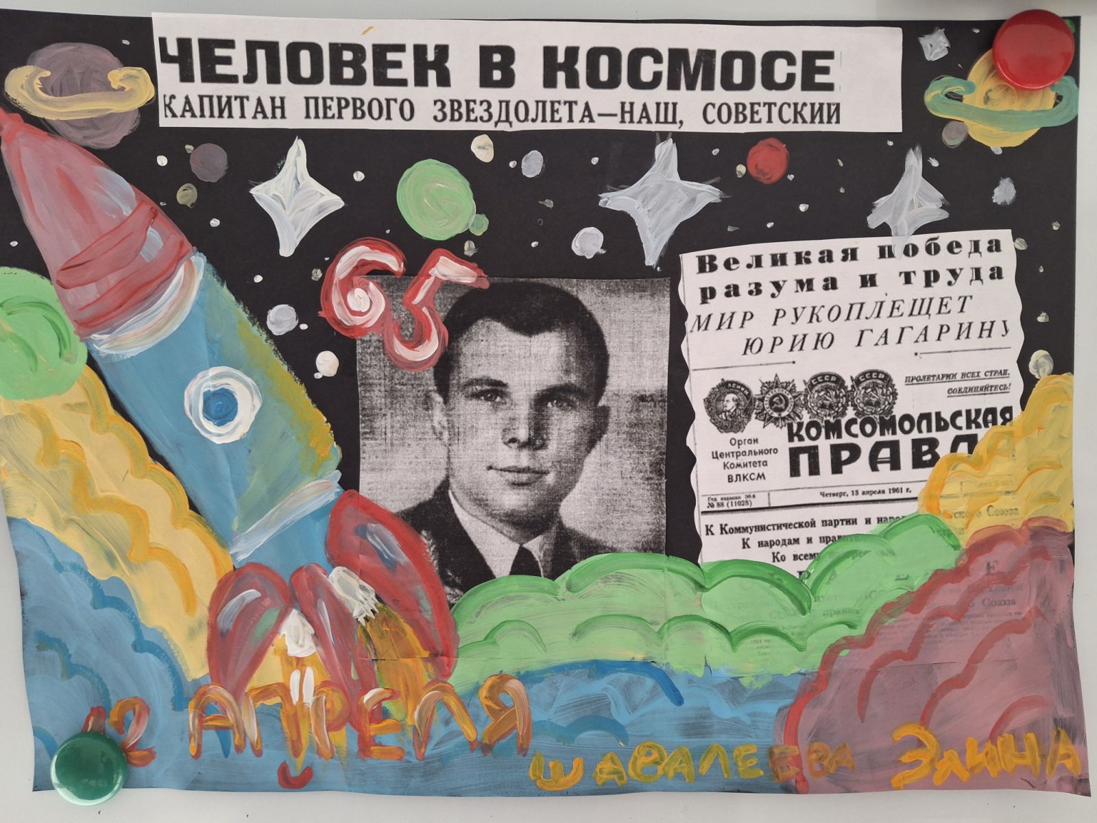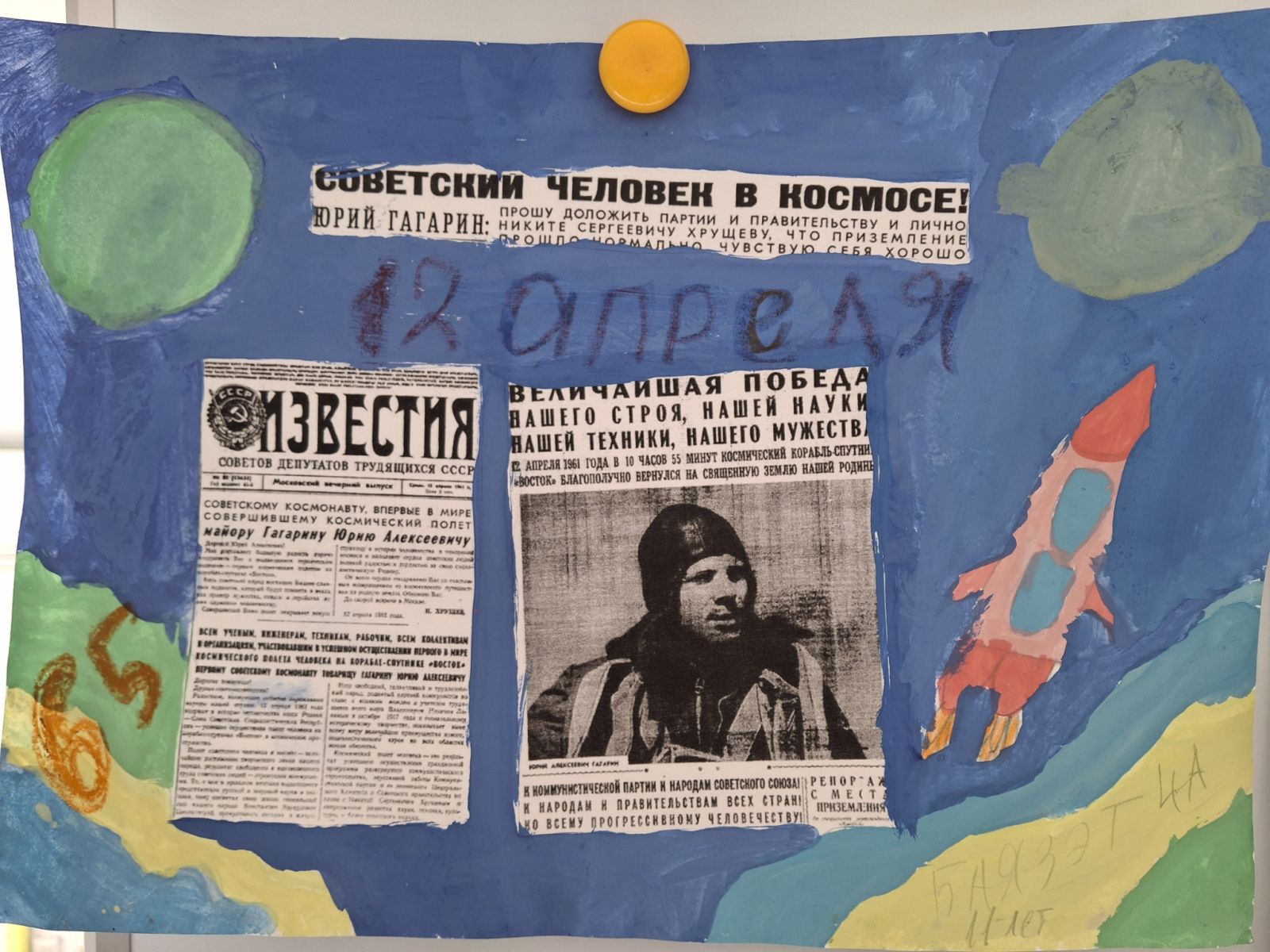 12 апреля 2026 года исполнилось 65 лет со дня первого полёта человека в космос — полёта Юрия Алексеевича Гагарина на космическом корабле «Восток». Свои рисунки-коллажи, посвященные этому событию разместили в фойе детского центра обучающиеся художественного объединения "Вдохновение" (рук. Мухаметзянова С.Р.). Детский рисунок ребят сочетается с вырезками из газет, журнальных статей и фотографиями на тему космоса.