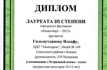 Хайдарова Камила, ученицу 9 класса школы № 86, воспитанница ЦДТ «Танкодром», п.д.о. Закиров Р.К. - диплом лауреата за 4 место,
