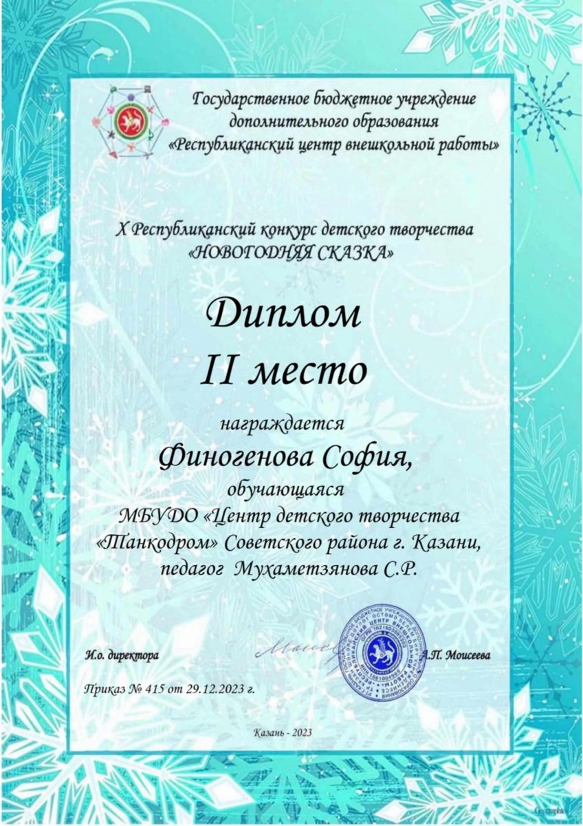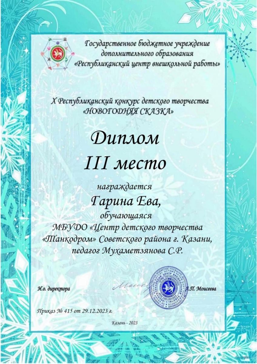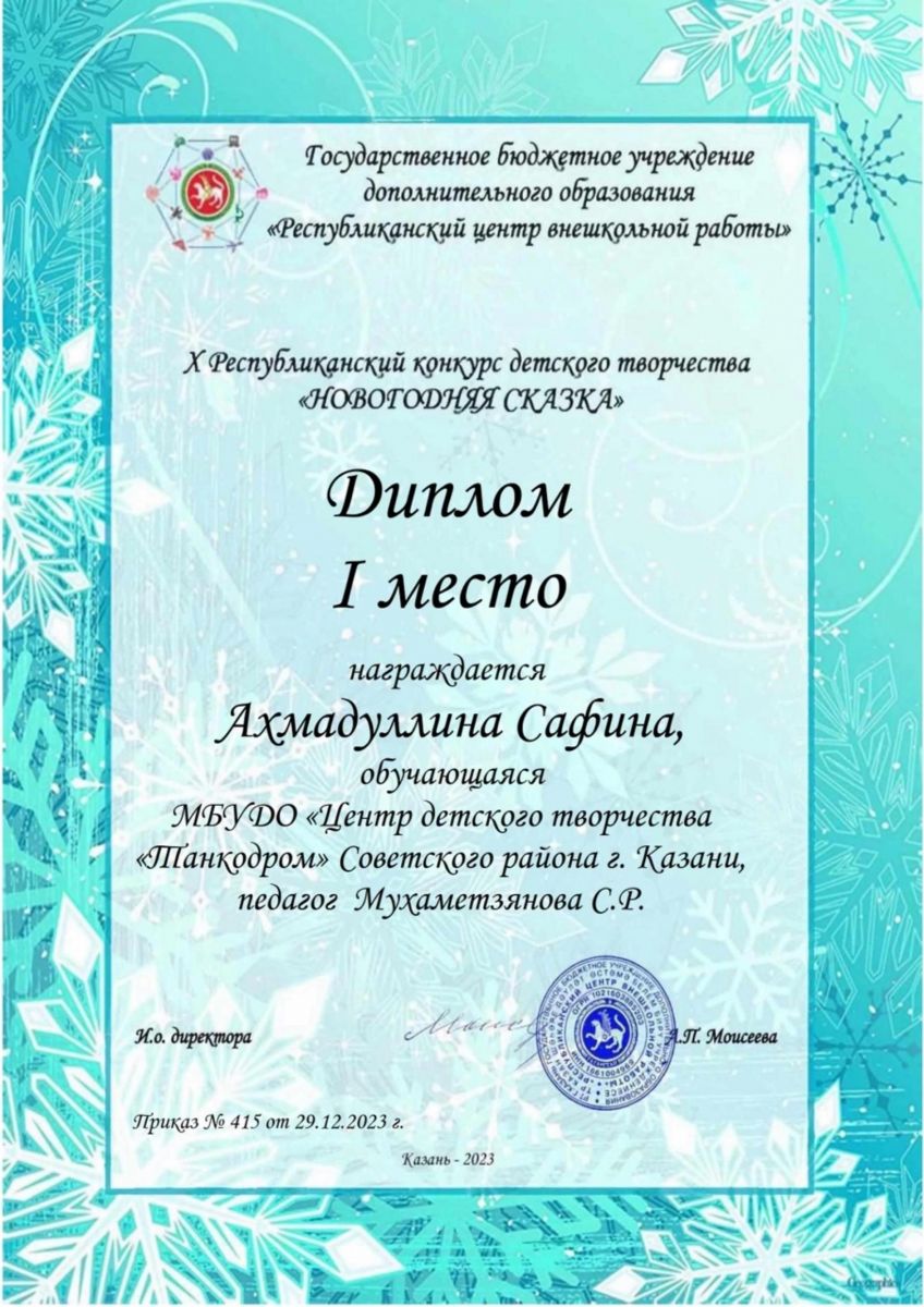 Поздравляем победителей Республиканского конкурса детского творчества "Новогодняя сказка" учащихся объединения "Юный художник" (рук. Мухаметзянова С.Р.)!