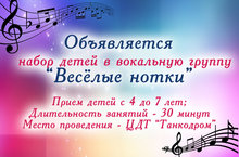 Объявляется набор детей в вокальную группу “Весёлые нотки”. Приём детей с 4 до 7 лет. Длительность занятий 30 минут.