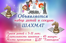 Объявляется набор детей в секцию шахмат. Прием детей с 5 до 11 лет. Время занятий - среда и пятница с 15:00 до 15:45. Место проведения - ЦДТ “Танкодром”.