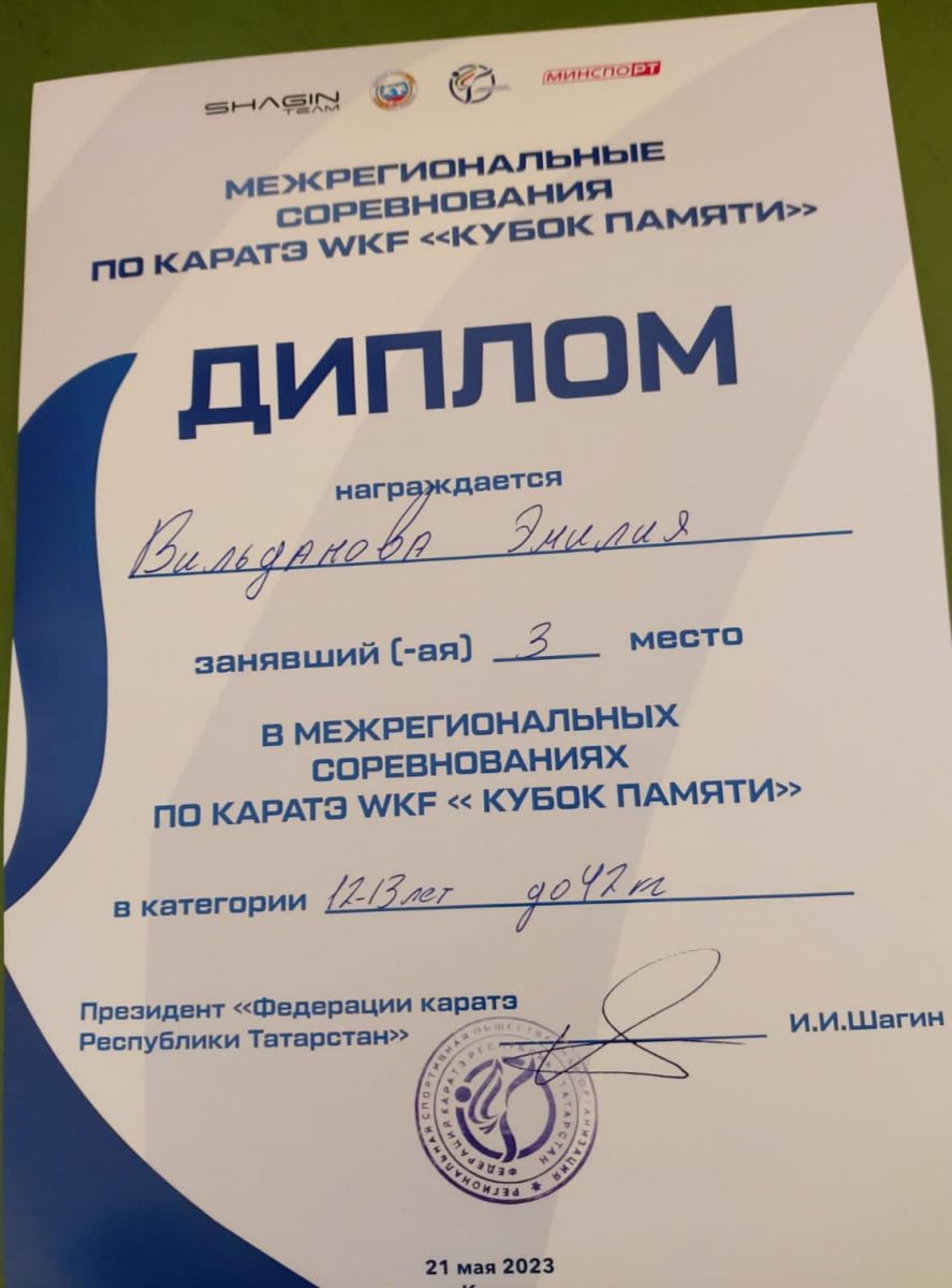 21 мая 2023г. в Универсальном Спортивном комплексе «Ак Буре» в Казани, состоялись межрегиональные соревнования по каратэ «Кубок Памяти», посвященные памяти Президента Федерации Каратэ Республики Татарстан Шагина Искандера Рафаэлевича и спортсменки Фаттаховой Эльвины Марселевны.