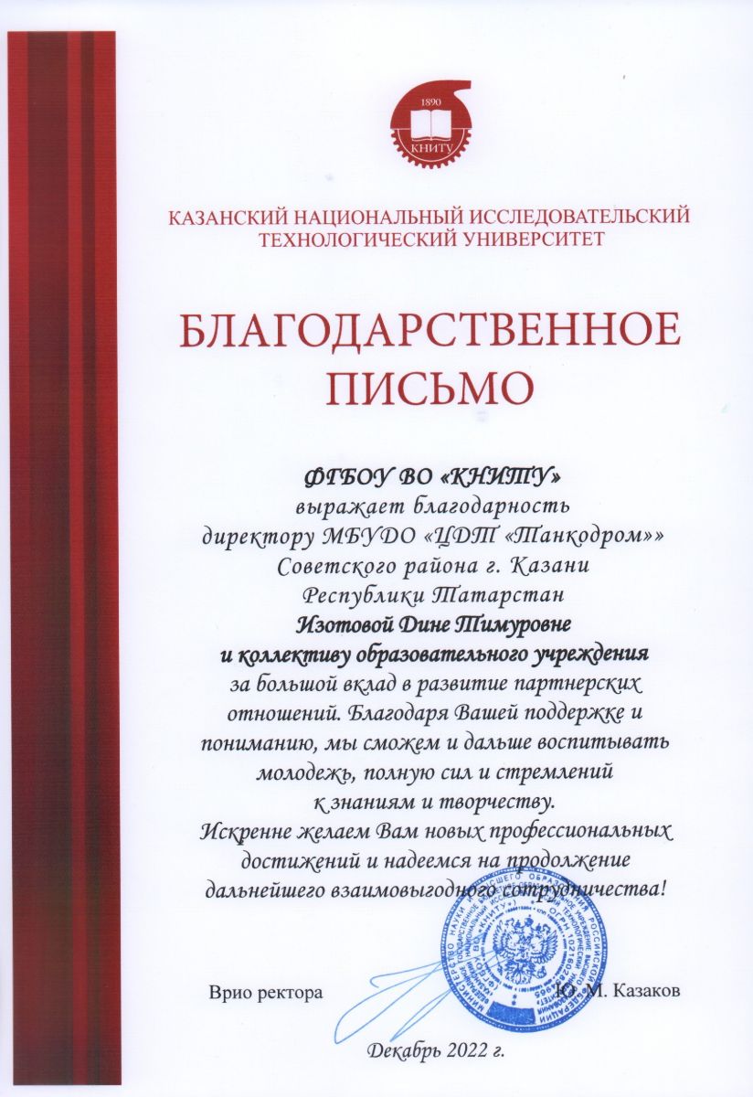 15 декабря 2022 г. корпоративный университет СИБУРа (руководитель - Рустам Галиахметов) провел на базе КНИТУ ежегодную сессию с образовательными организациями-партнерами. В мероприятии совместно с представителями вузов Казани, Москвы, Санкт-Петербурга, Красноярска, Тюмени, Нижнекамска и других городов принимала участие директор ЦДТ “Танкодром” Изотова Д.Т. Участники сессии обменивались между собой лучшими практиками в реализации образовательных программ в области химии, сотрудничества с предприятиями отрасли между образовательными организациями, для выстраивания системной работы по подготовке будущих кадров для химической промышленности.
