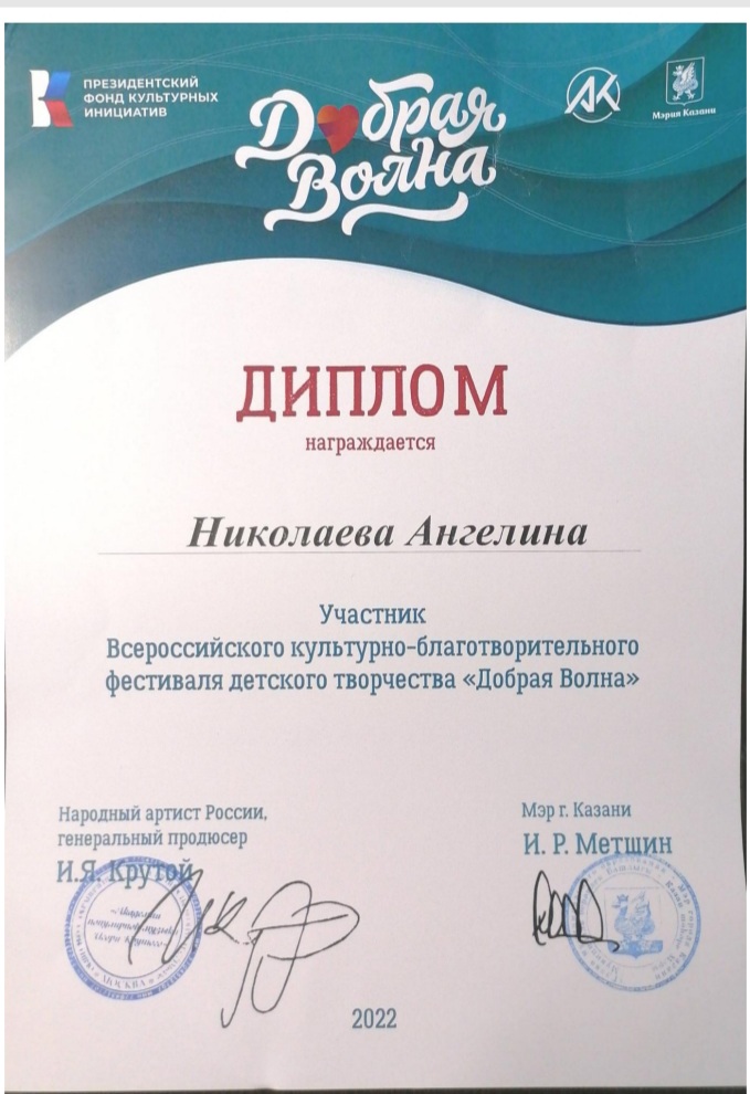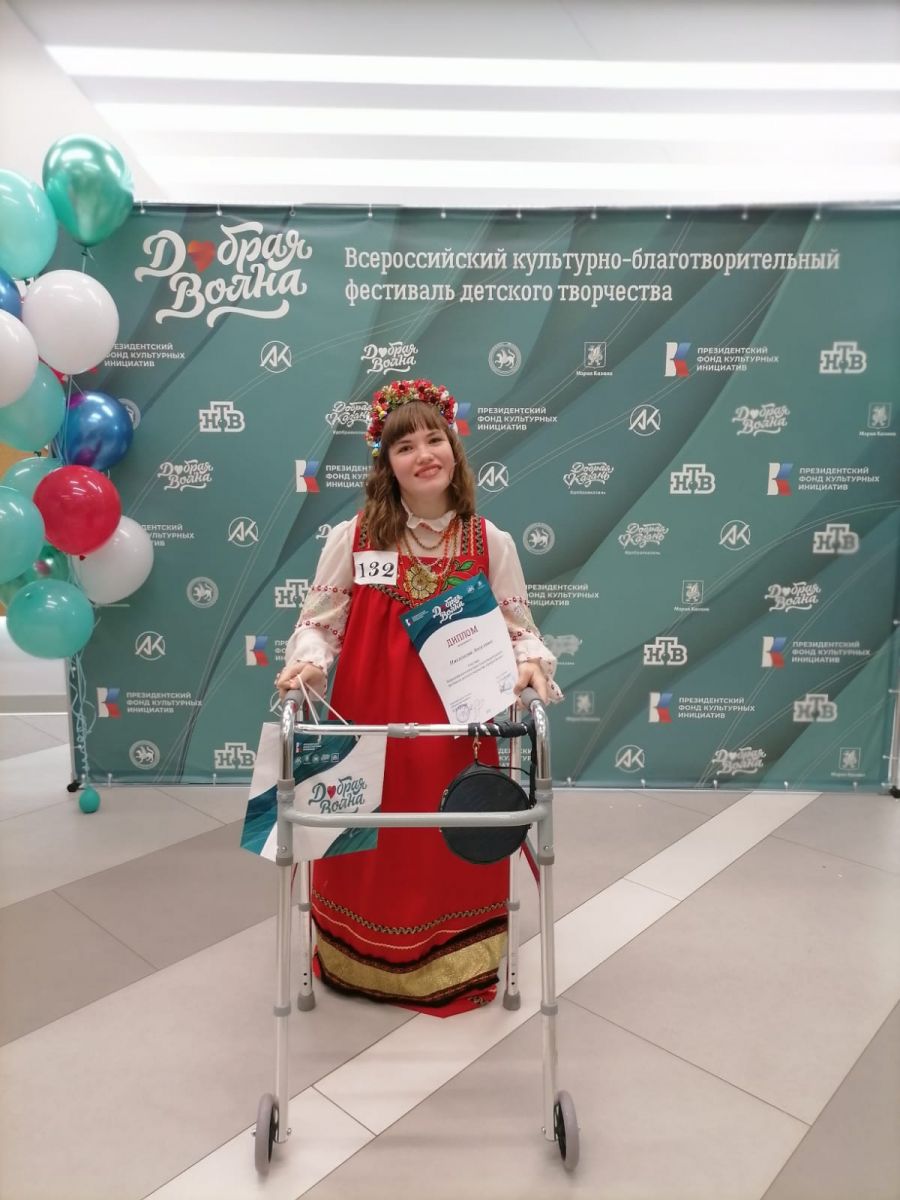 С 26 по 27 ноября 2022г. учащаяся вокального ансамбля "Чишмэ" "ЦДТ Танкодром" Николаева Ангелина (рук.Мифтахутдинова К.К.) приняла участие во Всероссийском культурно-благотворительном фестивале детского творчества "Добрая волна" для детей с ограниченными возможностями.